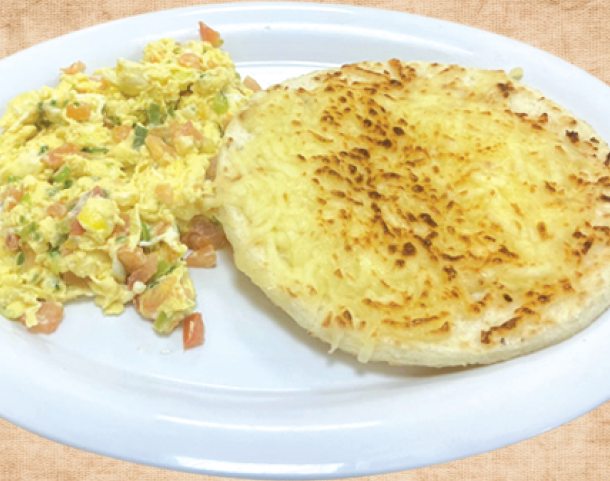 HUEVOS AL GUSTO Y AREPA CON QUESO Eggs any style and corn cake w/ cheese