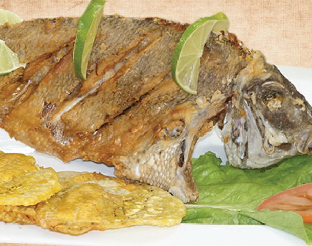 ARROZ, TOSTONES Y ENSALADA Fried Porgie Rice, green plantain and salad