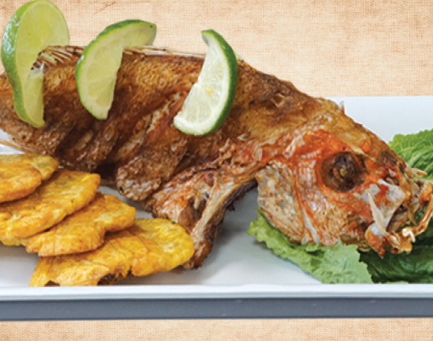 ARROZ, TOSTON ENSALADA Fried Red Snapper Rice, green plantain and salad