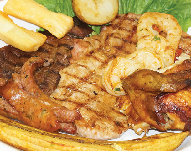 CARNE POLLO, CAMARÓN, ARROZ, FRIJOL Y MADURO Mixed Meats Steak, chicken, shrimp, rice, beans and sweet plantain
